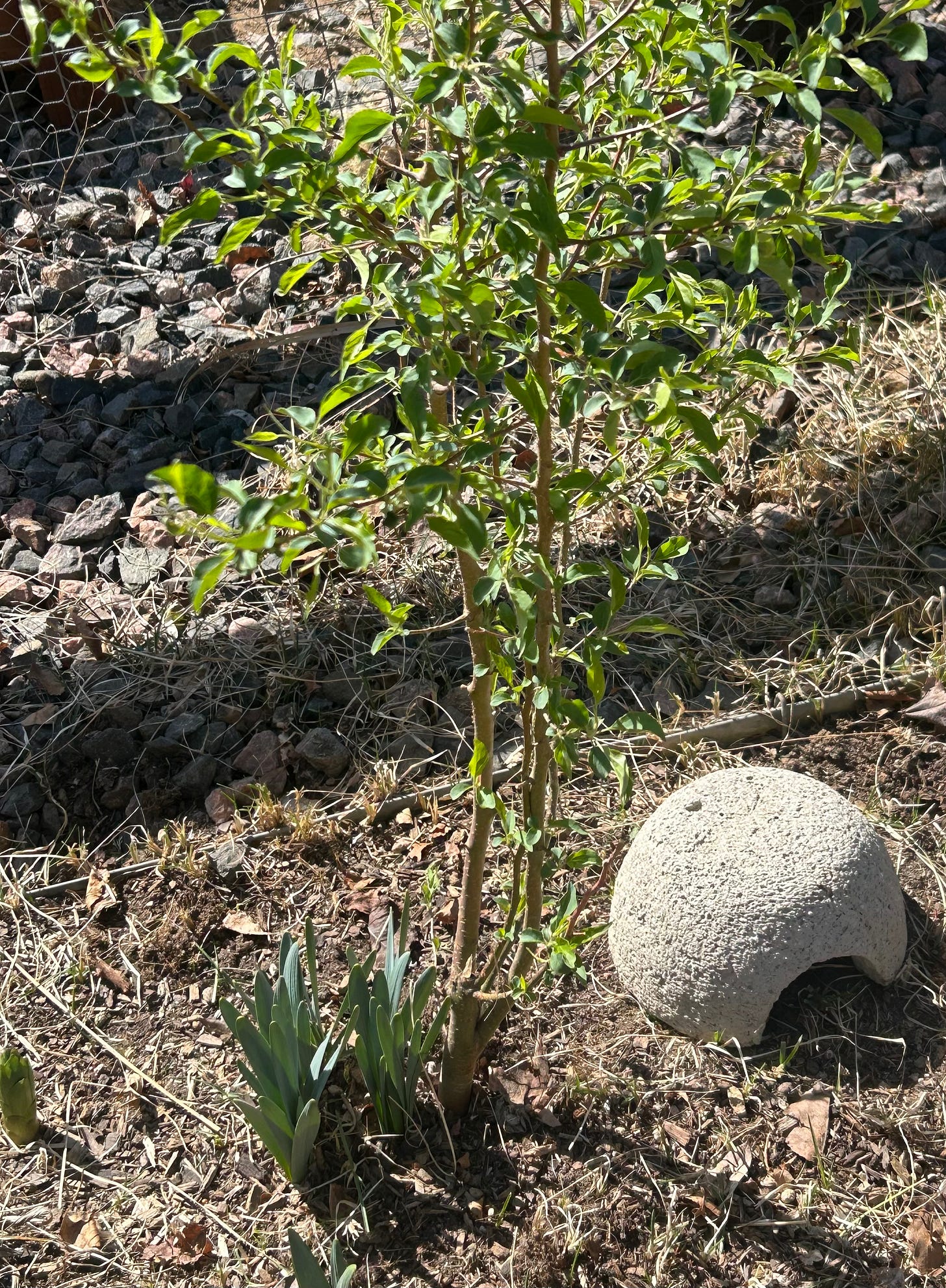 It is so dry and so brown and at the same time, a mystery tree popped up in our backyard. A mystery tree that is bright green, and doesn’t seem to miss the water at all.